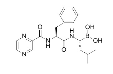 Bortezomib (PS-341, LDP-341, MLM341) is a potent 20S proteasome inhibitor with Ki of 0.6 nM. It exhibits favorable selectivity towards tumor cells over normal cells. Bortezomib (PS-341) inhibits NF-κB and induces ERK phosphorylation to suppress cathepsin B and inhibit the catalytic process of autophagy in ovarian cancer and other solid tumors.